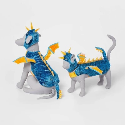 Transform your furry friend into the cutest and least-fearsome dragon ever with this Full-Body Metallic Dragon Glow Eyes Cat and Dog Costume from Hyde & EEK! Boutique™. This full-body costume features blue dragon scales and shiny orange wings, and it comes with a separate headpiece featuring shiny golden spikes on a scaly blue base and metallic dragon eyes. Made from lightweight fabric for comfortable wear, it features a hook-and-loop closure on the straps to keep it in place as they join you in Halloween festivities.