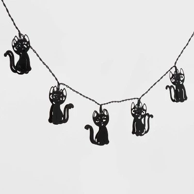 Add a fun and spooky accent and illuminate any corner of your home with these 10-Count LED Cat Halloween Metal String Lights from Hyde & EEK! Boutique™. Measuring over five feet in total length, this light string features 10 long-lasting LED bulbs in metal black cat frames strung on a black cord. Powered by two AA batteries (not included), the bulbs give off constant purple light to fill your spaces with an atmospheric glow.