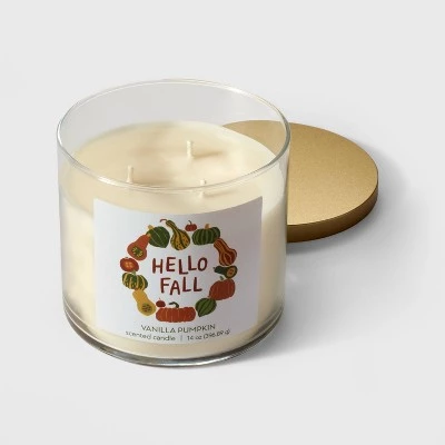 Set the right mood at home with the 14oz Vanilla Pumpkin Jar Wreath with Lid Halloween Candle Off-White from Hyde & EEK! Boutique™. This candle comes in a lidded glass jar and the vanilla and pumpkin scents gives a refreshing vibe. With a burn time of up to 40 hours, you can store this Vanilla Pumpkin Candle and light it up when you need a well-deserved break.