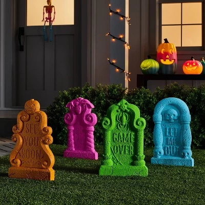 Create a haunted ambience anywhere around your home with this 4-Pack Colorful Foam Halloween Decorative Tombstone Set from Hyde & EEK! Boutique™. This set of Halloween props feature four different designs of tombstones in pink, blue and green and orange colors. Ideal for indoor and outdoor display, these foam props come complete with two metal stakes for securing them into the ground. You can place them next to your graveyard scene in your garden or somewhere indoors to liven up your spooky decor.