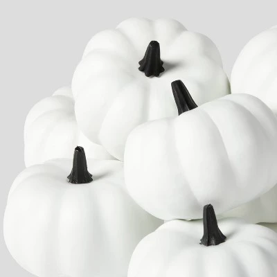 Add seasonal vibes to your decor with this 8-count Painted Pumpkins Halloween Decorative Sculpture Set from Hyde & EEK! Boutique. This set of mini pumpkin figurines makes a perfect addition to your fall or Halloween decor. Each piece features a sculpted shape in a warm white finish with black stem detail. Place a few on an entryway table, shelf or windowsill to add festive flair to your home.