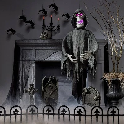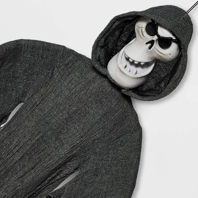 Give your haunted house decor a ghoulish touch with this Animated Skeleton Ghoul Halloween Decorative Mannequin from Hyde & EEK! Boutique™. This hanging Halloween decoration features a skeleton mannequin wearing a hooded black robe for a flowy, frightening finish, and its open mouth lights up with the help of the included three AAA batteries. Designed for sheltered outdoor use, you can hang this decorative prop on your porch or patio alone or with other Halloween props for an eerie display.