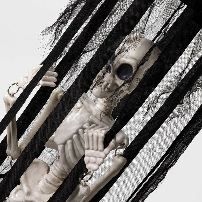 Create a creepy atmosphere to welcome party guests or trick-or-treaters this Halloween with the help of the Animated Skeleton in a Cage Halloween Decor from Hyde & EEK! Boutique™. This hanging Halloween decoration features a skeleton grasping at the bars of a black cage, and it lights up and shakes when activated by sound. Suitable for indoor or sheltered outdoor use, it’s a perfect addition to your haunted home.
