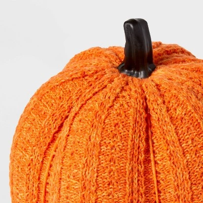 Accent your home in festive style with the Harvest Crewel Ribbed Knit Pumpkin from Hyde & EEK! Boutique™. This orange pumpkin features a crewel ribbed knit pattern for a textured and appealing look. Designed with a stem, this large pumpkin decor piece looks great on a shelf or tabletop.