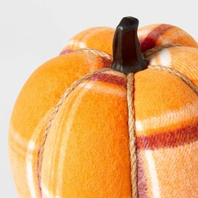 Bring classic charm to your seasonal setting with this Medium Harvest Plaid Pumpkin from Hyde & EEK! Boutique™. This orange, burgundy and cream pumpkin prop makes a great addition to your autumn decorations. It features a sculpted shape that’s covered with a plaid pattern and black stem. The large-size pumpkin decorated with jute rope detailing is suitable for tabletop or shelf display in a variety of locations around your home.