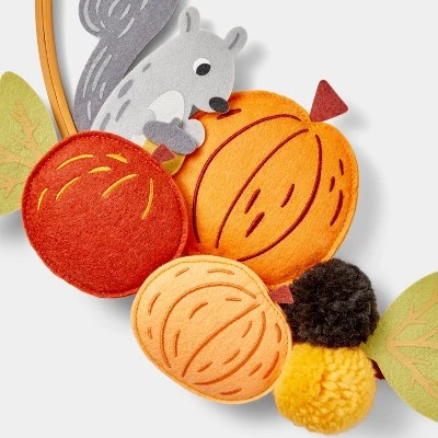 Lend delightful appeal to your seasonal decor with the Harvest Pom Pom “Hello Fall” Hoop Wreath from Hyde & EEK! Boutique™. This hoop wreath features pumpkins, squirrel and leaves along with the message “Hello Fall” at the center for an amazing display. Designed with fabric, this pompom wreath makes a beautiful addition to your fall decor.