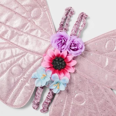 - Includes floral crown with rainbow tassel and sparkly pink butterfly wings with floral accents