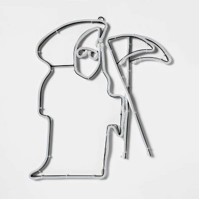 Add a neon-look glow to any window, door or wall with the Reaper with Motion Rope Halloween Light Sign from Hyde & EEK! Boutique™. Glowing in green, white and purple, this novelty light sign makes a cool addition to your Halloween decor. It features a grim reaper shape made of 387 durable, long-lasting LED lights that give it the look of a neon light. You can easily hang it anywhere indoors or outdoors using the attached hanging ring to create a scary-fun atmosphere for Halloween parties or trick-or-treating.