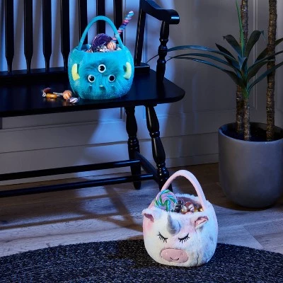 Add spooky style to the trick-or-treat fun with the Plush Monster Halloween Trick or Treat Pail from Hyde & EEK! Boutique™. This blue monster pail comes complete with eyes, mouth and green horns for a decorative look. Made with a soft and lightweight fabric, this round trick-or-treat pail creates an amazing display on display or while carried.