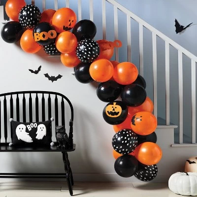 Add a bootiful finish to your seasonal decor with the Pumpkins Halloween Arch Balloons from Hyde & EEK! Boutique™. This balloon arch set includes orange and black balloons in solid colors plus some with dotted print or jack-o-lantern face print for festive appeal. Plus, you also get paper jack-o-lantern hangings as well as hangings that spell out “BOO”. Best of all, the pack comes complete with adhesive, tape and thread so you can start setting it up right away.