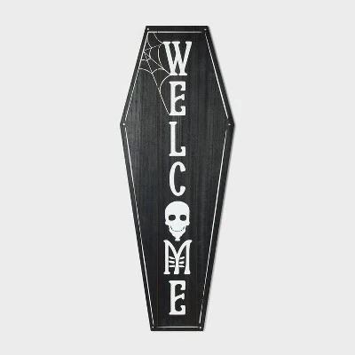 Capture the spirit of the season by adding this Reversible ‘Happy Halloween/Welcome’ Halloween Sign from Hyde & EEK! Boutique™ to your interior decor. Designed in the shape of a coffin, this decorative Halloween sign features the message “Happy Halloween” written on the front in orange on a black background, complete with a dangling spider graphic. The reverse showcases the message “Welcome” in white with the “o” replaced by a skull. With just a few inches shy of four-feet length, you can let it stand by your front door, beside the mantel or in a corner in the living room to create the perfect ambiance.