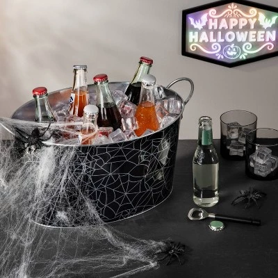 Thrill guests with a spooktacular setup using the Spiderweb Metal Halloween Beverage Tub from Hyde & EEK! Boutique™. This black beverage tub is covered with an allover spiderweb design for frightening appeal. Made with metal, the tub is suitable for cold beverages and comes with side handles for convenient carrying. Simply fill it with ice cubes and add cans or bottles of drinks to let your guests help themselves.