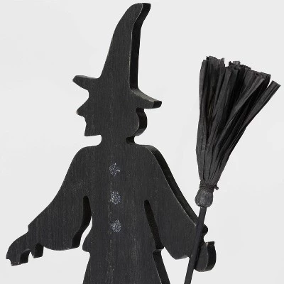 Accentuate your Halloween decor with this Standing Witch with Cauldron Halloween Decorative Sculpture from Hyde & EEK! Boutique™. This wooden sculpture is designed as the silhouette of a witch in black holding a broomstick in their hand standing beside a cauldron brimming with a green potion and a green potion bottle. Great as a solo accent, it can also be arranged with other sculptures on your kitchen shelf, tabletops, windowsill or mantel for a striking Halloween display.