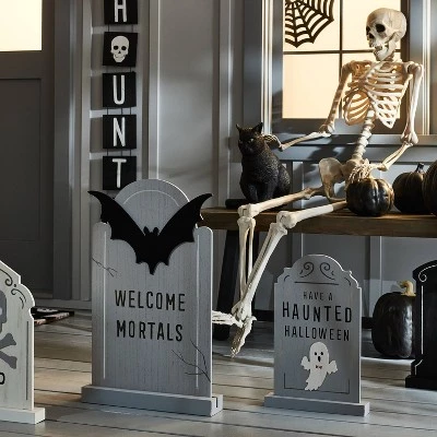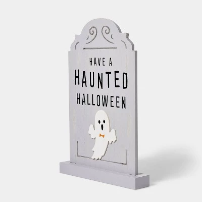 Create a thrilling graveyard scene with the Wood “Have a Haunted Halloween” Decorative Tombstone from Hyde & EEK! Boutique™. This decorative tombstone features a ghost with the message “Have a Haunted Halloween” to make it perfect for the fall season. Made with wood, this gray decorative tombstone can be displayed in both sheltered outdoor spaces and indoors.