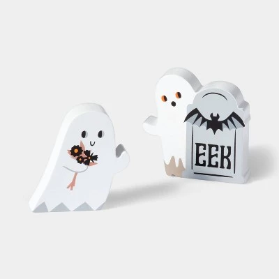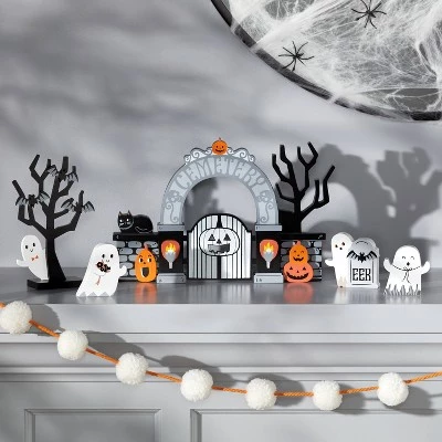 Accessorize your mantle with this Wood Mini Mantle Ghosts and Tree Halloween Decor from Hyde & EEK! Boutique™. This set of assorted Halloween props includes different designs of white ghosts, a black tree with bats on it and a tombstone accent for a cute and creepy look. These mini-sized props are ideal for placement on a mantle, shelf or console table. You can display them together or along with other Halloween-themed props to complete your festive setting.