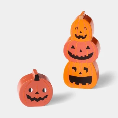 Complete your spooky Halloween decor with this Wood Mini Mantle Pumpkins/Cat/Tombstone Halloween Decor from Hyde & EEK! Boutique™. This set of assorted Halloween props includes different designs of pumpkins, a cat and a tombstone accent for an cute and creepy look. These mini-sized props are ideal for placement on a mantle, shelf or console table. You can display them together or along with other Halloween-themed props to complete your festive setting.