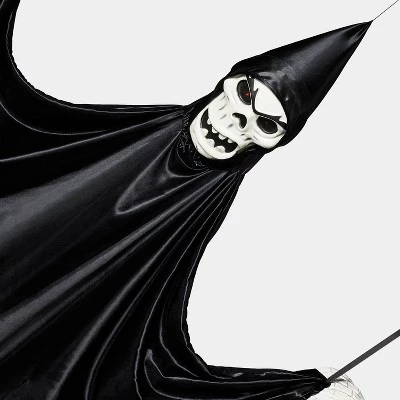 Add eerie vibes to your home decor with this XL Flowing Ghoul Halloween Scene Prop from Hyde & EEK! Boutique™. This hanging Halloween decoration features a flowing skeleton ghoul dressed in a black hooded robe. This scary Halloween prop comes with attached cords on the corners for easy hanging, and it’s suitable for both indoor and sheltered outdoor use. Display it above your graveyard scene, or hang it on your front porch or patio to bring a frightening look to your decor.