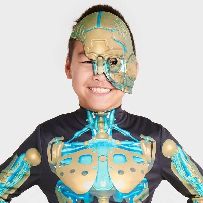 Your kid can rock a unique and slightly creepy look this Halloween with the Robot Skeleton Halloween Costume Jumpsuit with Mask from Hyde & EEK! Boutique™. Made from soft, lightweight fabric, this costume includes a full-body robot skeleton jumpsuit plus a half-face robot mask. Designed in black, blue and gold hues, they can pair the costume with black shoes to complete the look.