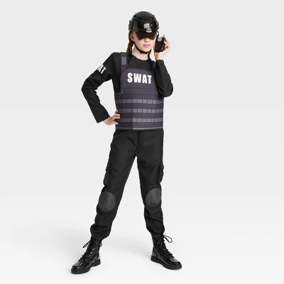 Your kid will look and feel like their hero on Halloween night in this SWAT Officer Halloween Costume Jumpsuit with Accessories from Hyde & EEK! Boutique™. Crafted from lightweight material, the costume set includes a walkie talkie, SWAT vest, jumpsuit and helmet. The side patch pockets add functional detail to their look, while the back hook-and-loop closure offers ease of wear. Pair with black shoes to complete the look.